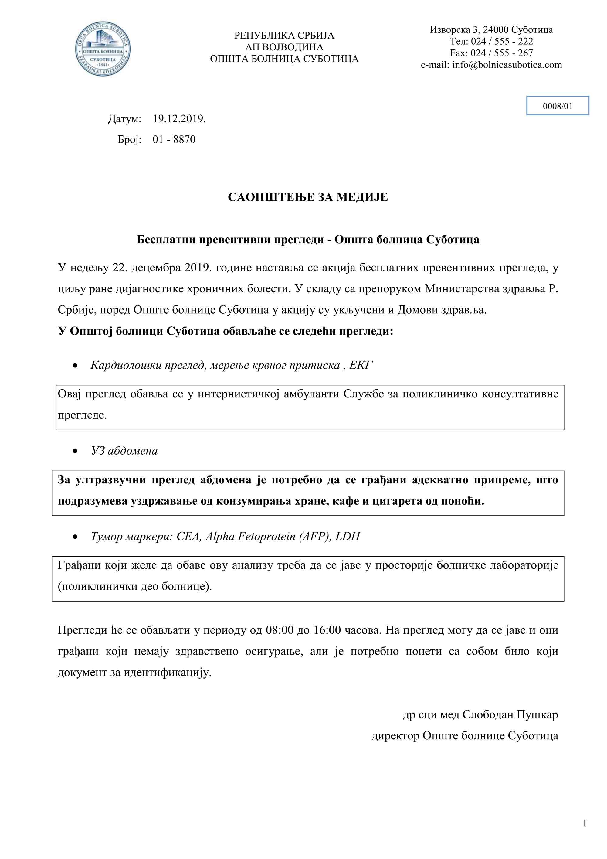 Бесплатни превентивни прегледи-Општа болница Суботица