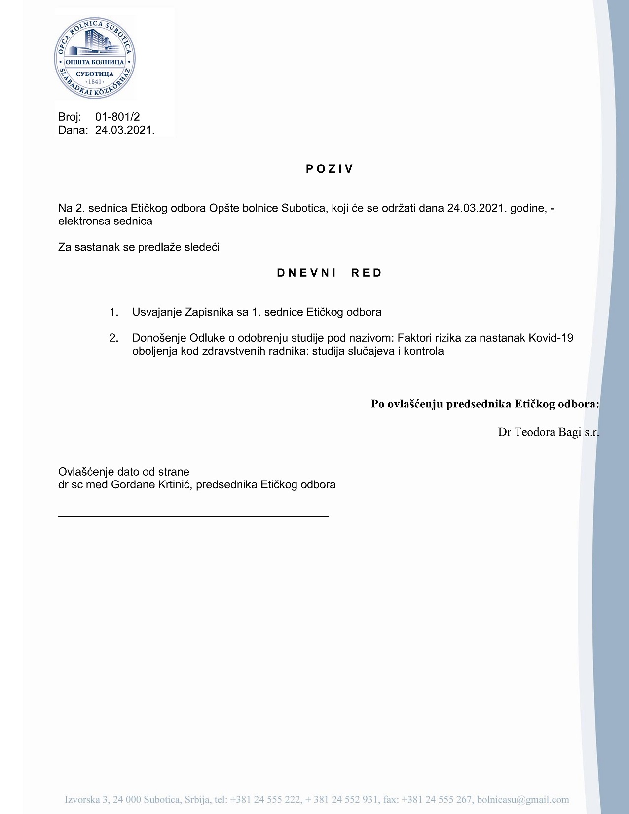 П О З И В На 2. седница Етичког одбора Опште болнице Суботица - електронсkа седница